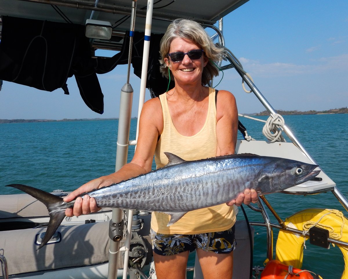 The wind finally picked up at 10:45 and we had a lovely sail as the wind freshened to 15 knots - it’s amazing how you can rely on the wind in this area. Glenys put out a fishing line and caught a nice Spanish Mackerel - fish for dinner!