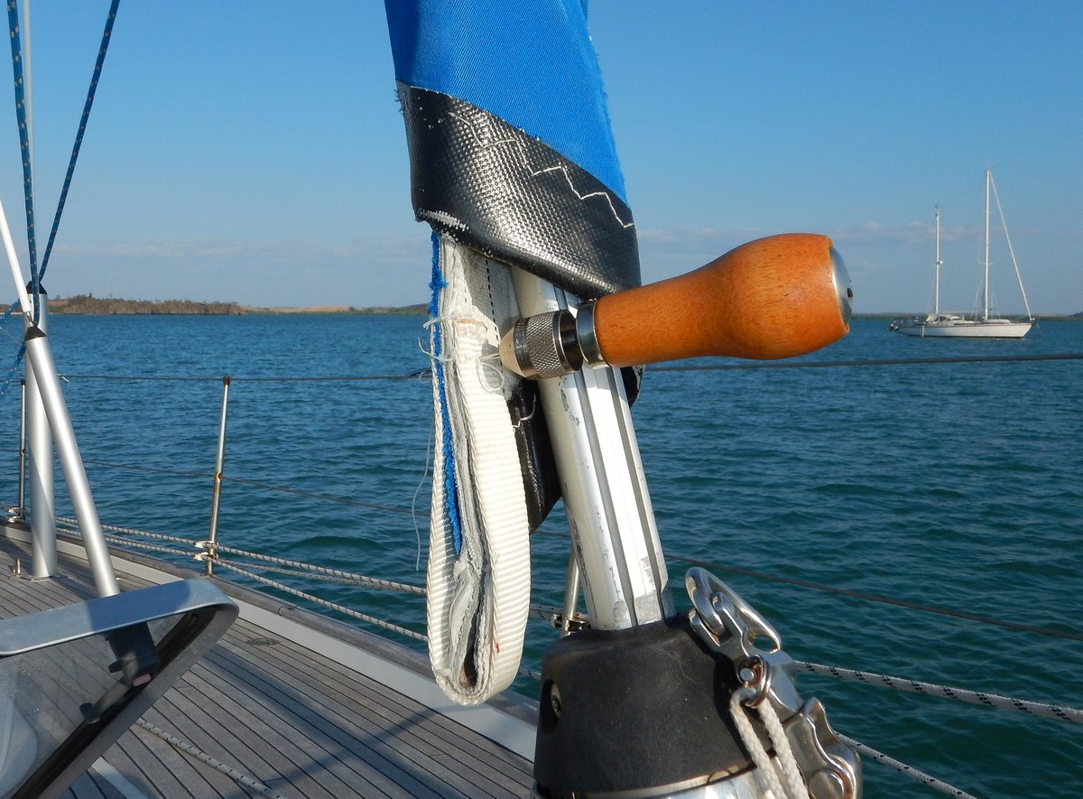 Later in the afternoon, I sewed an extra piece of webbing onto the tack of the staysail. There were two pieces of webbing, but one has perished in the sun. It was a mission sewing through 12mm of webbing and sail cloth, but our “Speedy Stitcher” once again handled the job.