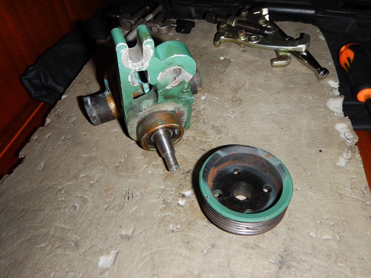 It took me 30 minutes to remove the pump and then 30 minutes to pull it apart. I had a few tense moments. The drive pully wouldn’t come off the pump shaft - I was desperately trying not to damage anything, but after a little perseverance with a gear puller, it popped off the taper. The next trauma was getting the shaft out of the pump body. My pullers didn’t work, so I eventually I took a deep breath and gave it a good smack with a nylon mallet and thankfully it came out.