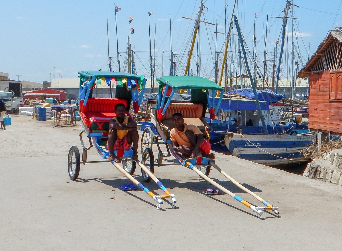 Flushed with success, we hailed another tuk-tuk to take us to the Leader Price supermarket. After leaving our empty jerry cans with the bag security guy, I left Glenys in the air-conditioned store and went out looking for an ATM. Majunga town is a scruffy, dusty place with a few nice colonial buildings, but it’s mostly rundown, concrete buildings. The preferred mode of travel appears to be tuk-tuks, but there are also many two person rickshaws around, being pulled by fit young men running along the road, often in bare feet.