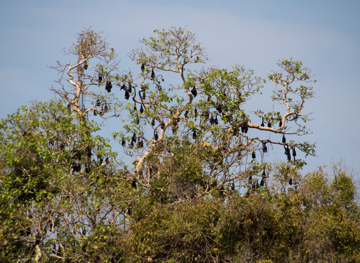 The island is about a mile in diameter and mostly arid apart form a small forest on the west side. We strolled through the resort and chatted to the manager, who told us that they have 26 bungalows, but had nobody staying at the moment - it seems that it’s a very quiet season. There was some interesting birds around including some very nervous guinea fowl, small green parrots and a few hawks. We also saw a large colony of Fruit Bats hanging in a tree.