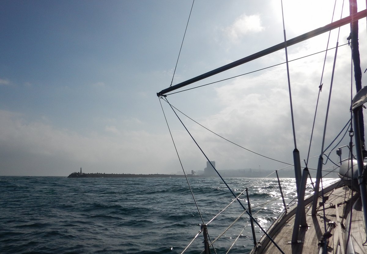 When we motored out of the harbour, there was a 3 metre swell coming from the south. It was a gentle swell, but steep at the harbour entrance. Once clear of the shipping channel, we bore away and headed south-west on a beam reach. The wind gradually increased and backed, so I poled the genoa out to port and we rolled off down wind.