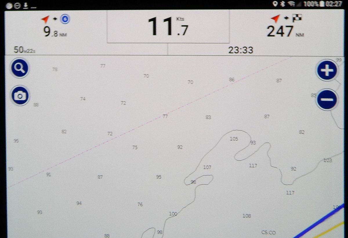 At the 100 metre contour, we hit a counter current, so I headed more south, out to sea, aiming for the 200m contour. Our SOG dropped to 3.5 knots for an hour, but miraculously, at the 200 metre contour, we picked up a 3 knot favourable current and off we went. During my 7-10 watch, the wind remained at 8-10 knots slowly backing, but not enough to sail.