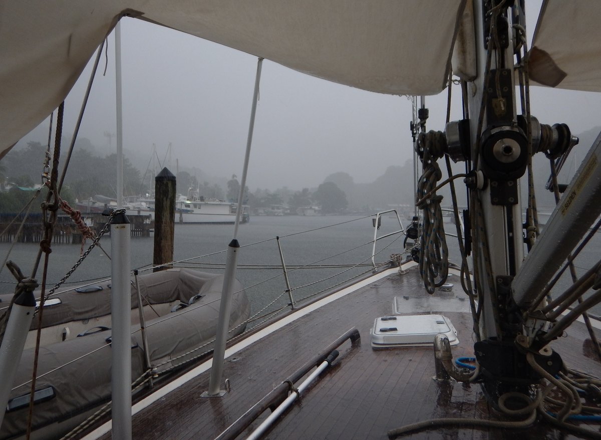 Back at the boat, we took down the awning and Glenys gave it a good scrubbing.  When it was fairly dry, she dragged out her sewing machine and did some essential repairs, reinforcing stitching that had perished in the tropical sun.  We had heavy rain showers in the afternoon and evening.  In a brief lull, we managed to get the bimini back in place.  It looks nice and clean now, but the water proofing has been scrubbed off and it leaks like a sieve.