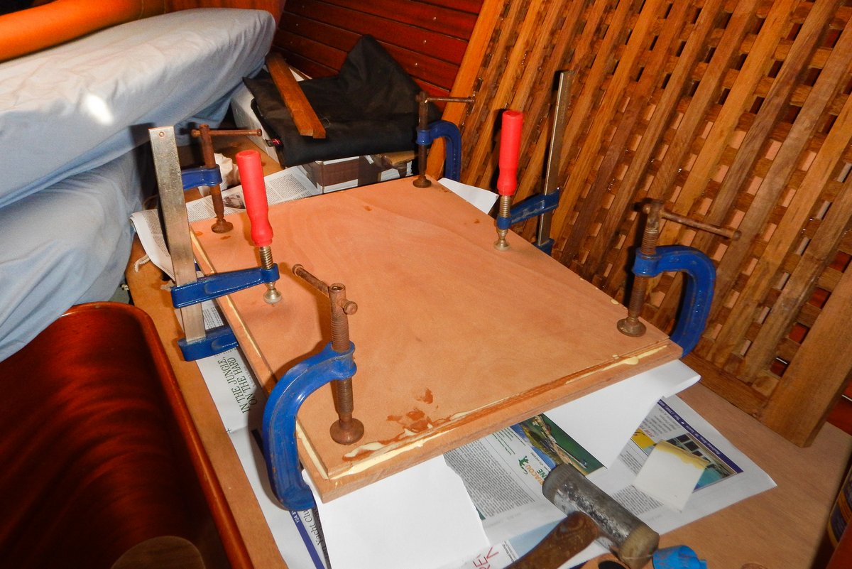 I picked up six pieces of plywood from one of the carpenters, so that I can make three cupboard doors for the front heads.  They’ve charged me $120US to supply and cut up ½ sheet of marine plywood, which is outrageous, but they tell me that the marine plywood is imported hence the high cost.  I glued and clamped one of the doors - I only have enough clamps to do one a day, so it will take a whole week to do the job including the painting.