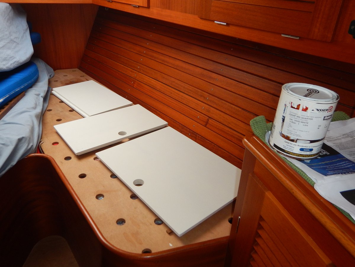 Glenys removed the spray-hood and gave it a good scrubbing - she now needs to waterproof it. I did a bit of wood work on the cupboard doors that we’re making for the front heads. It’s a fiddly job, fitting the hinges and latches before painting.