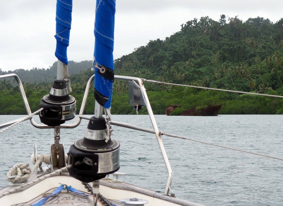 At half past eight, we picked up the anchor and motored around to Uliveo Island, a mere five miles away. We had to weave our way though some reefs and encountered big standing waves just off the island where the 20 knot wind was against a two knot current, but that was only short lived.