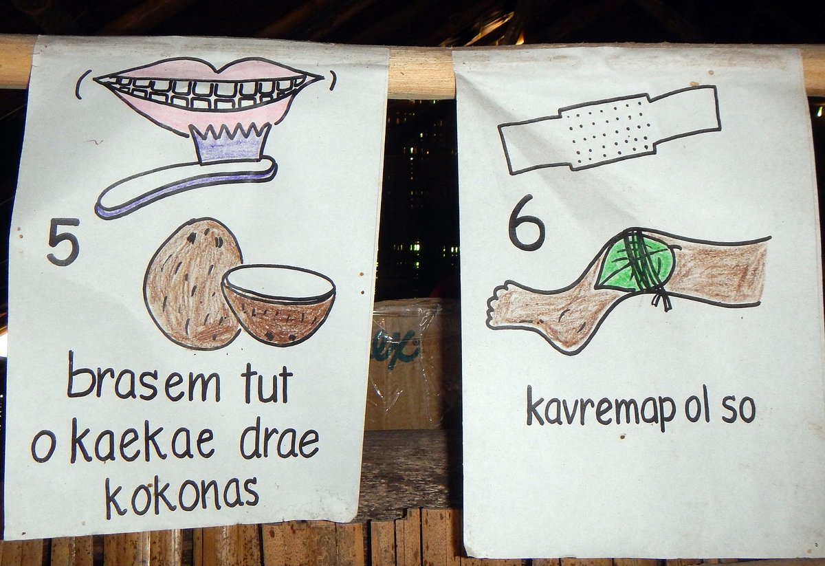 In the Kindergarten, I was intrigued by a set of small hand written posters instructing the kids in ten steps to basic health and hygiene. It was all written in Bislama, which is a kind of pigeon English and makes sense when you say it out loud.
