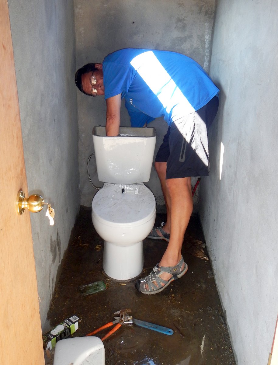 In a brief lull in the conversation, Tim suddenly asked me if I knew anything about toilets. “Errr, a little”, I said cautiously. He took us for a walk through the village where some guys were working on a new toilet block for the village. They’ve bought six flushing toilets from Port Vila, but there are no instructions and the first toilet that they’re installing was leaking. I had a fiddle with it and after removing and replacing the cistern three times, placing the seals in different places, I finally managed to get it sorted.