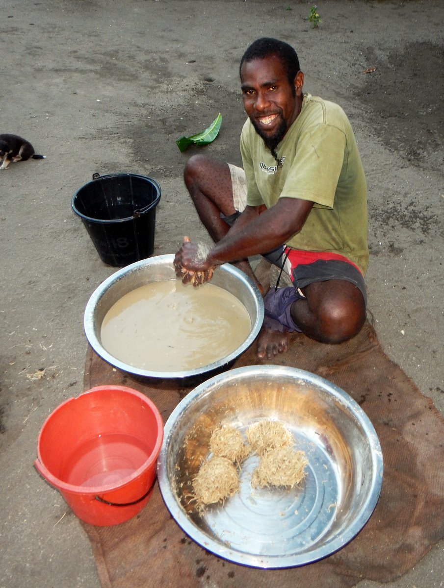 When we went ashore, Tim met us at the beach and took us to see the kava being produced. Basically, the root is pounded to a pulp, added to water and then sieved through cloth. It’s not a very hygienic process and the resulting liquid looks like grey, dirty dish water. There are photos of the process in the “Galley Slave”.