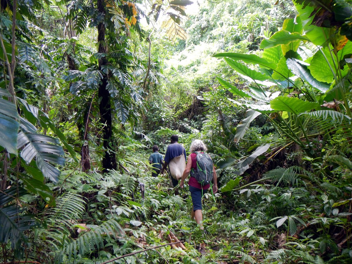 Hendry slashed at the vegetation to clear a path, while we slipped and slithered on the mud, hanging onto trees and vines. After about an hour, we had a torrential down-pour and within minutes were soaking wet through. We plodded on for 2½ hours, wading through streams and walking through varied landscapes including coconut groves, temperate woodland and dense jungle with tree ferns.