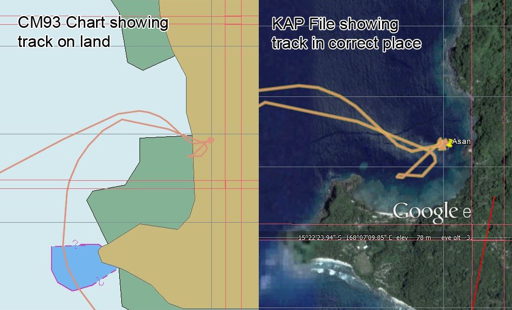 This is really useful for out-of-the-way anchorages, where our electronic nautical charts are often up to ¼ mile out of position - Google Earth images are said to be no more than 10 metres out of position. The KAP files don’t have any depth information, but by looking at the colour of the water, it’s pretty obvious where the shallow water and reefs are.