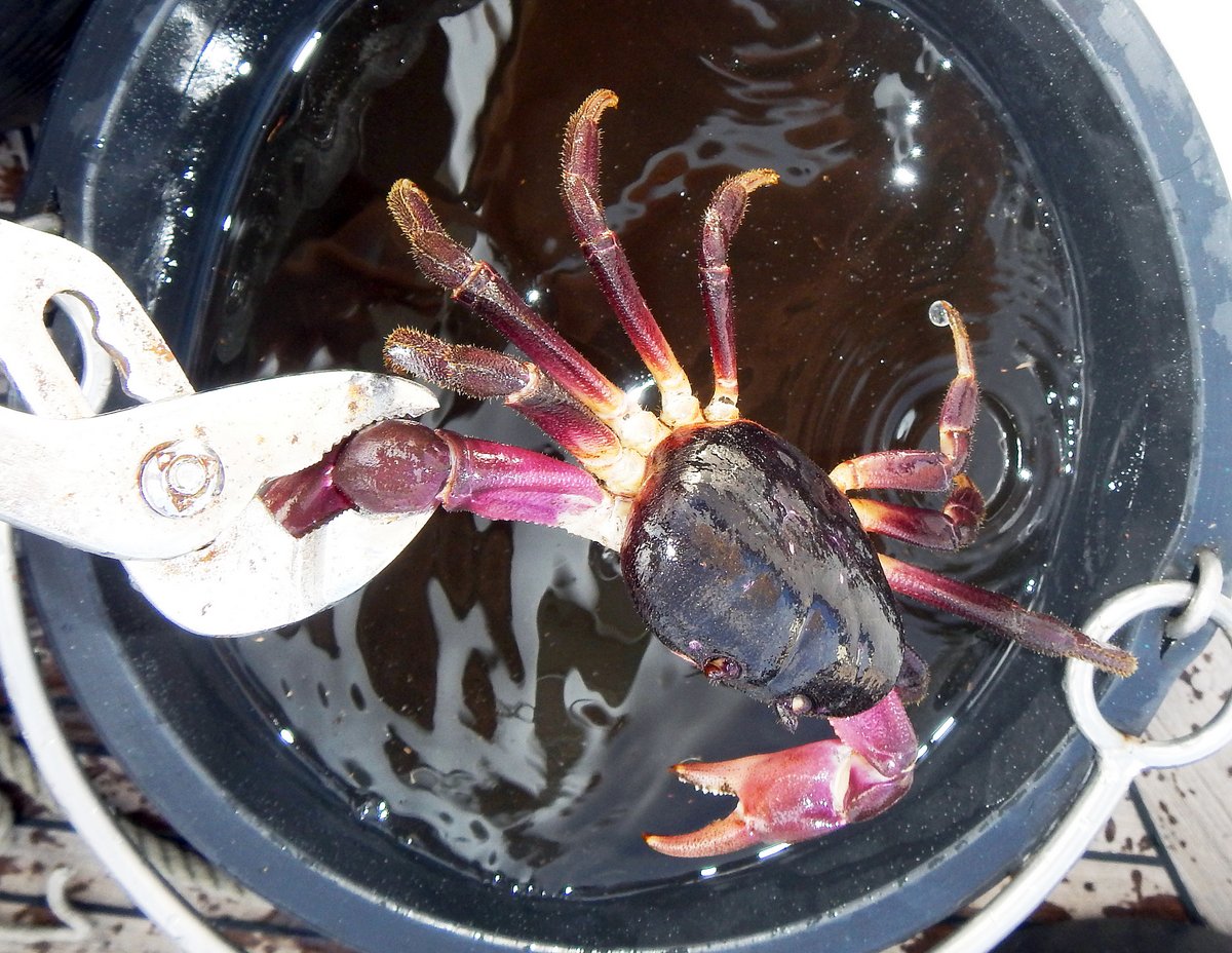 Back on the boat, we tackled the crabs, which were very dirty and very feisty. I ended up using a pair of pipe grips to grab each one to dunk it in a bucket of sea water to try to wash it - the crabs went bonkers, but were a little cleaner. Meanwhile, Glenys boiled up some water in a big pan with a trivet and using the pipe grips, I dropped each one into the steam. After seven minutes, we had cooked crabs.