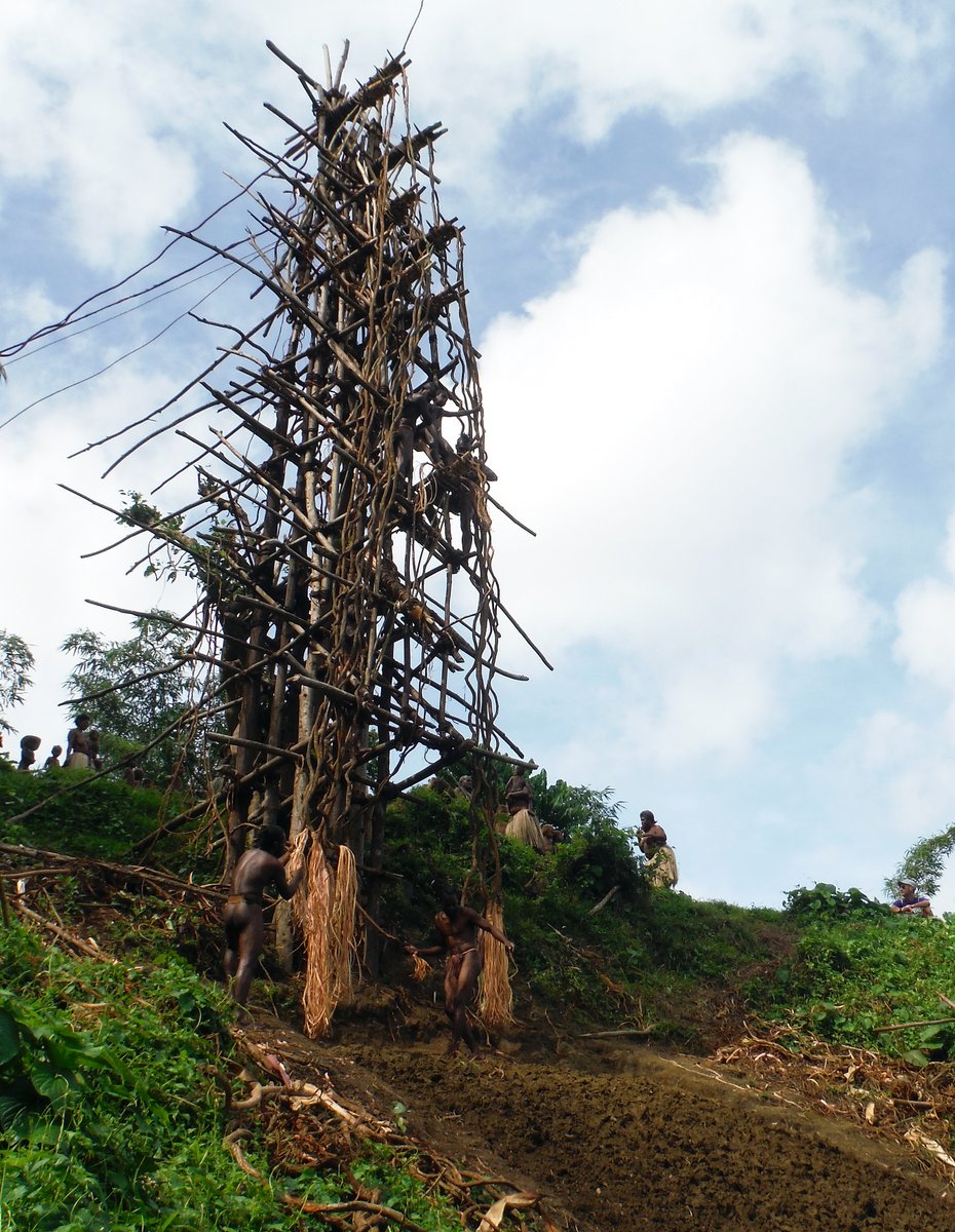 I was fascinated by the tower. It’s made from rough-hewn tree trunks and branches lashed together by small vines. The tower is perched on the edge of a steep slope and supported by thick vines leading to trees at the top of the slope. At each level of the tower there are small hinged platforms, which the flexible vines pass over. The platforms are supported by small sticks, which break when the vine becomes tight and acts as a shock absorber.