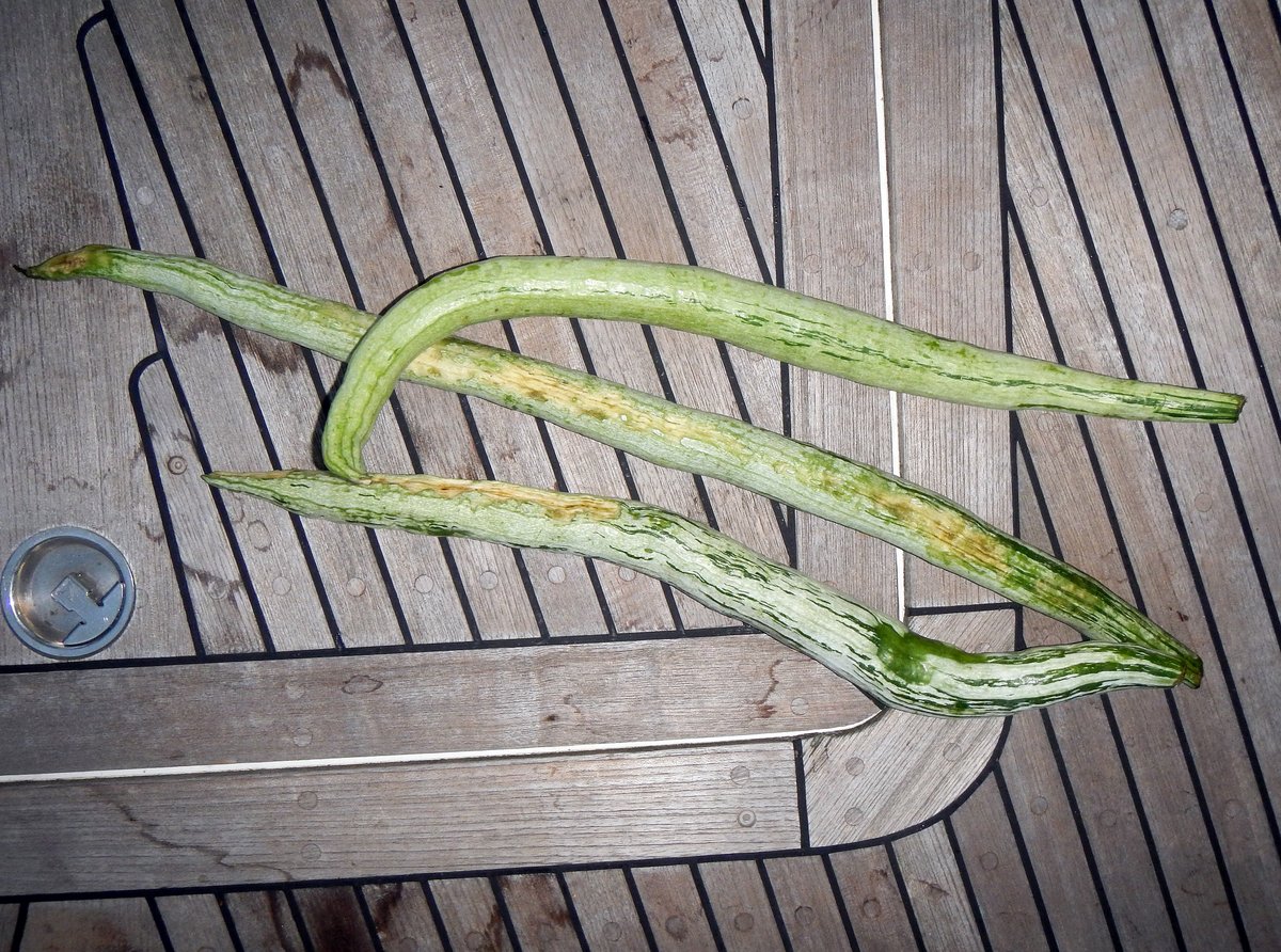 Before we left, some of the villagers appeared and gave us drinking coconuts; more pamplemousse; spring onions; a strange, two foot long bean pod called Snake Beans; and a writhing bag of twenty Land Crabs.