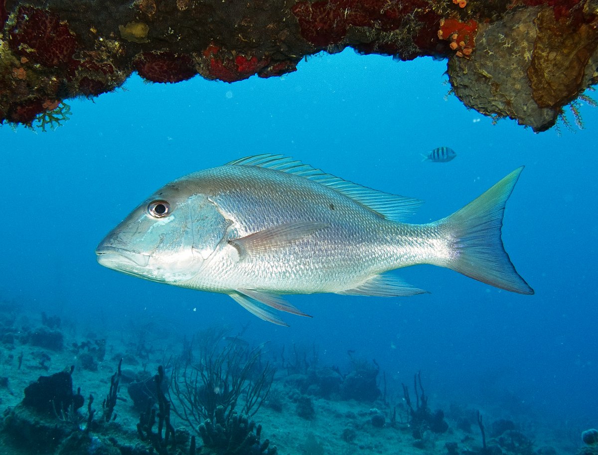After lunch, I went snorkelling around the headland to the south of the bay, but the reef was mostly rock with a small amount of hard coral and there was a strong current, so I soon gave up. As I went back into the edge of the bay, I came across a large pinnacle just off the shore, which was again rocky reef, but had a spectacular wall that dropped off to 30 or 40 metres. There were lots of large Snappers and other predatory fish swimming around on the outskirts of huge shoals of smaller fish - nice.