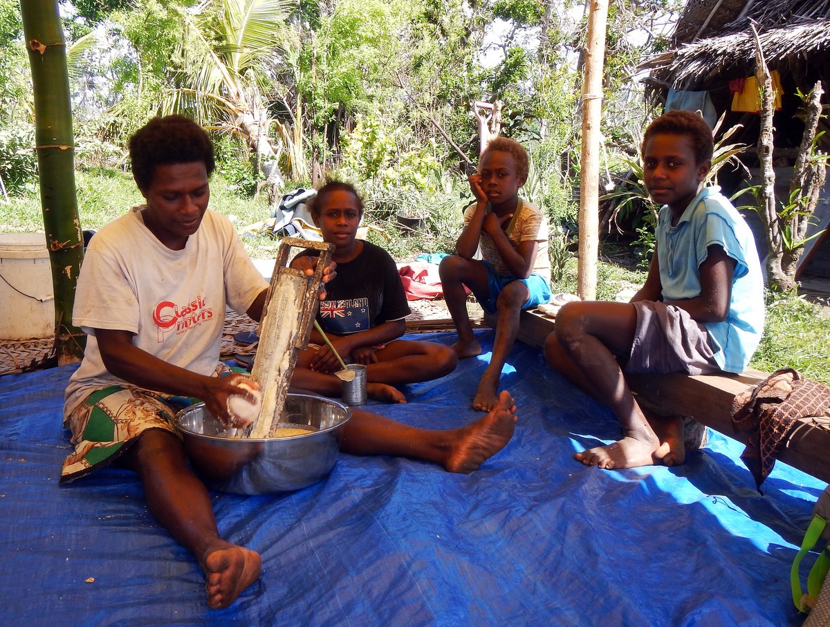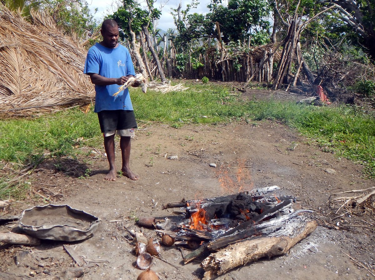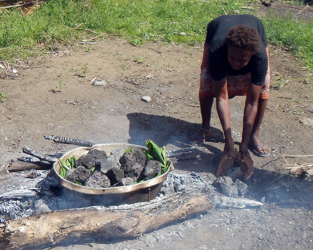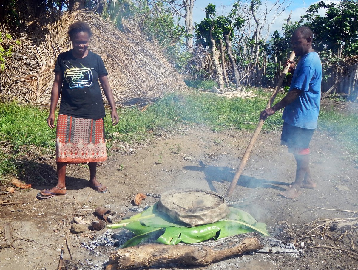 7. Place the pan on top of the fire and, using two halves of a coconut, pick up the hot stones and place on top |