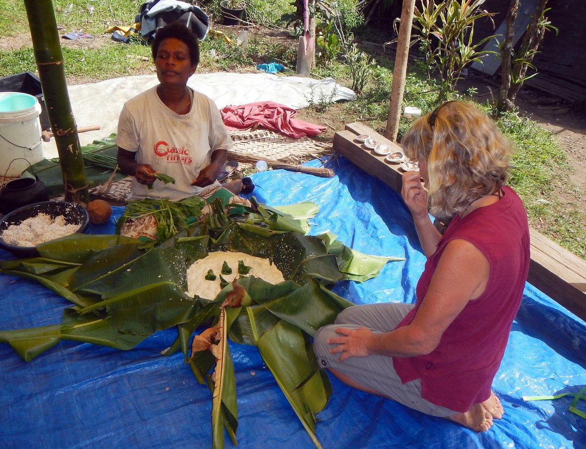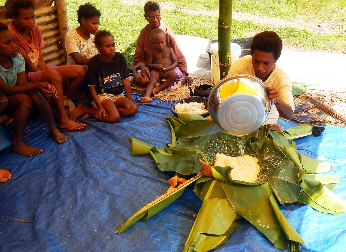3. Fold small pieces of Island Cabbage or young Taro leaves into cylinders and insert vertically into the cassava mixture creating small pockets. Sprinkle coconut cream over everything filling the cabbage tubes. |
