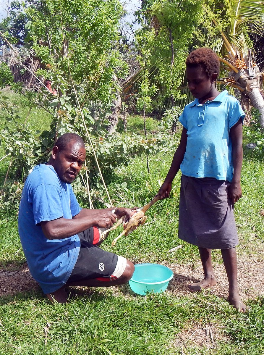 5. With the aid of a small child holding the head of the chicken, gut the chicken and cut up into pieces. Place the chicken pieces into a marinade made from soy sauce and some herbs. |