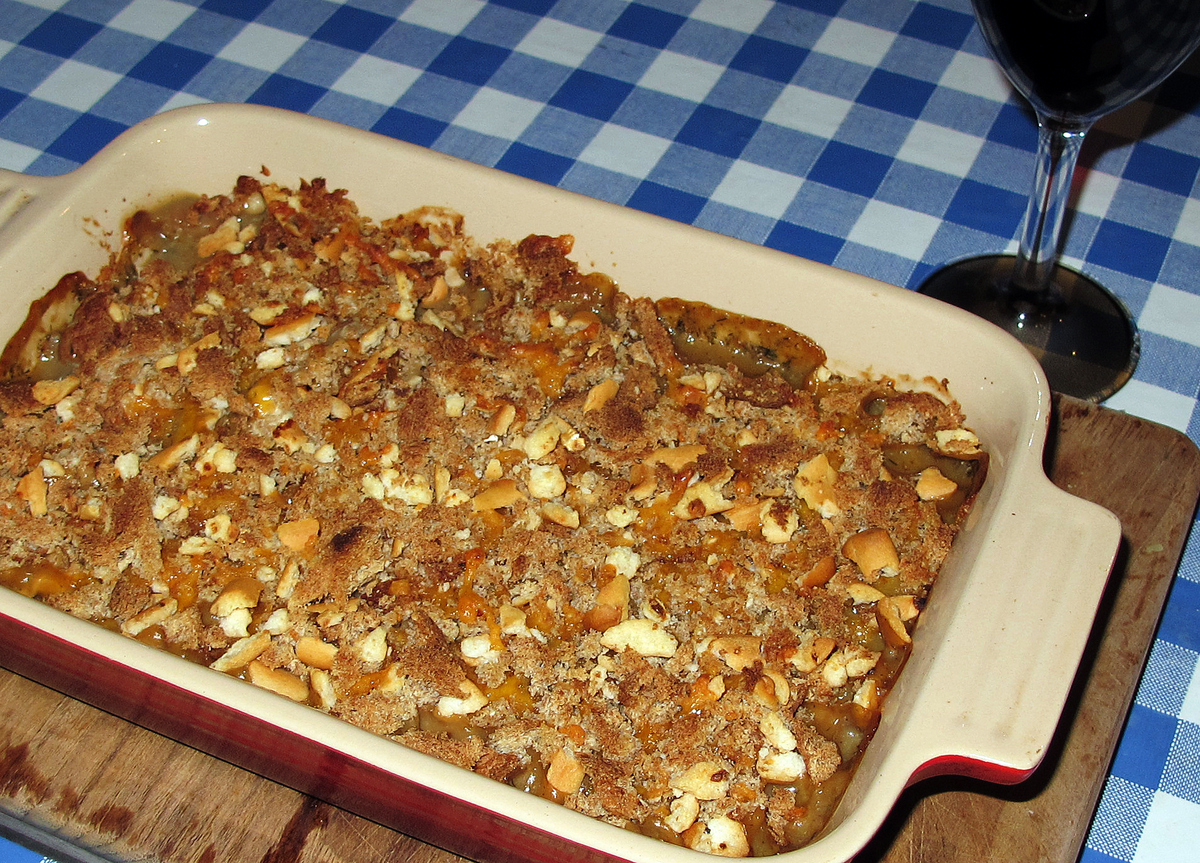 Turn into an oven-proof dish. Mix together the breadcrumbs, crackers and Parmesan and sprinkle over the top. Bake in the oven at 190 degrees C/375 degrees F for 25 minutes or until the crust has nicely browned.