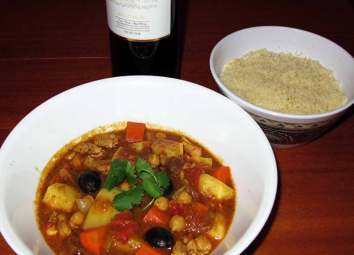 When the chicken is cooked, add the olives to heat through. Serve with some fresh coriander sprinkled over.